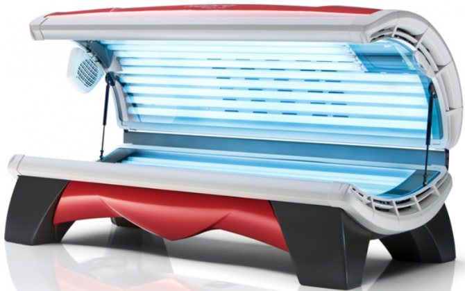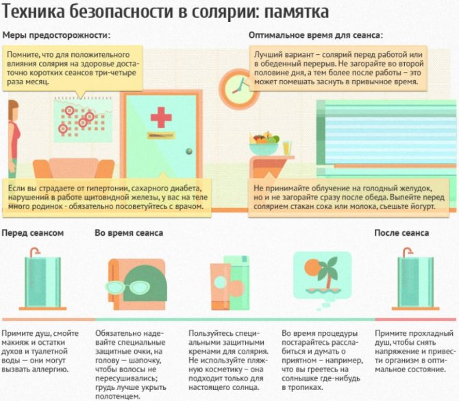 Механизм загара в солярии — тот же, что и на солнце. Но источником ультрафиолетового излучения являются не его лучи, а специальные лампы. Время пребывания под ними и их мощность рассчитываются с учётом фототипа кожи. Максимальная длительность процедуры для жгучих смуглых брюнеток — 12–15 минут при полной мощности ламп, для светлокожих блондинок и рыжих — 2–3 минуты на минимальной мощности. Для двух промежуточных фототипов — 4–10 минут при средней мощности ламп.