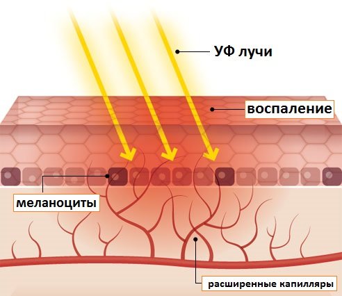 Попадающий на кожу ультрафиолет стимулирует процесс окисления липидов (жиров), что, в свою очередь, провоцирует накопление в тканях эпидермиса свободных радикалов. Эти соединения вредны для организма, поэтому он активирует защитную функцию, начиная активно синтезировать меланин с помощью специальных клеток — меланоцитов. Под воздействием пигмента кожа темнеет и грубеет, становясь менее восприимчивой к ультрафиолетовым лучам. Он же является мощным естественным антиоксидантом, защищающим глубокие слои дермы от воздействия свободных радикалов.