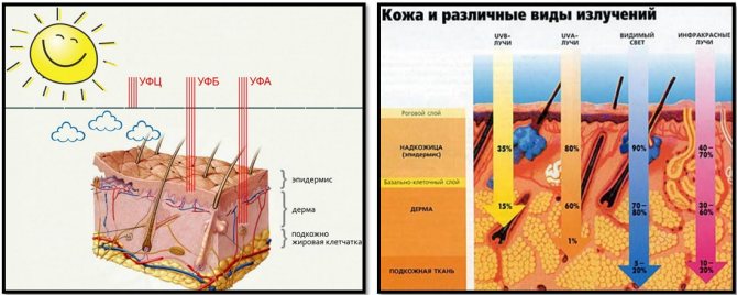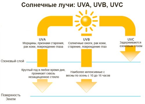 - UVA. Провоцирует фотостарение, появление мелких морщинок, сухость и шелушение кожи, может вызвать ожог роговицы.